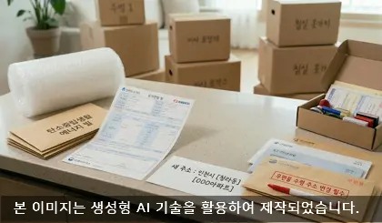 이사 전 공과금(전기, 수도, 가스 등)을 정리하고, 주소 이전을 완료합니다. 우편물 수령 주소 변경도 잊지 마세요.